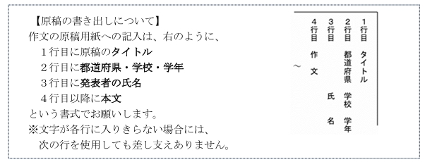 ホーム 新着情報 【少年メッセージ】原稿用紙について 2026.02.13 お知らせ 【少年メッセージ】原稿用紙について 県大会で使用する原稿用紙 400字詰め原稿用紙(A4版縦書き)に清書したもので、本人自筆による原本 (ワープロ不可・ただし障害等による場合は可) 原稿用紙 原稿の書き出し その他提出書類等、詳細は後日掲載予定です。
